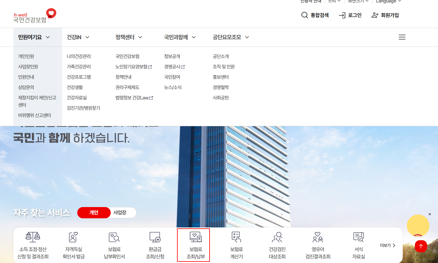 - 민원서비스 메뉴 선택: 홈페이지 상단의 ‘민원서비스’ 메뉴에서 ‘보험료 조회’ 옵션을 선택합니다.